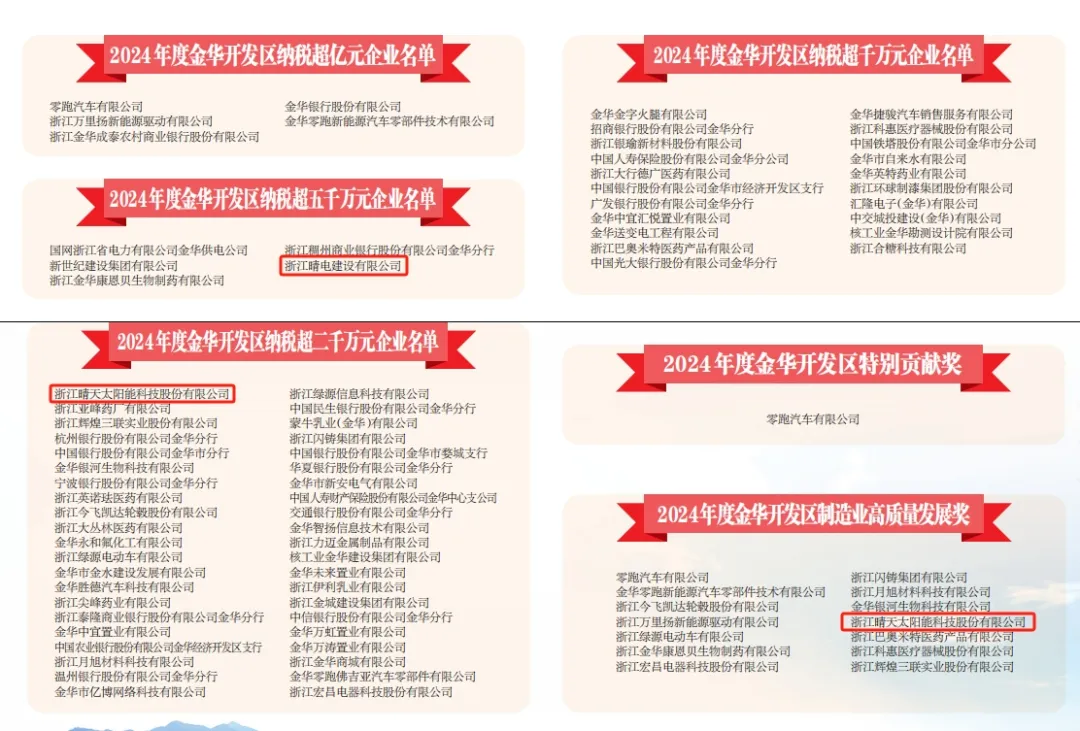 2025年2月12日,金華經(jīng)濟(jì)技術(shù)開(kāi)發(fā)區(qū)召開(kāi)2025年工作會(huì)議,會(huì)議全面總結(jié)了過(guò)去一年的經(jīng)濟(jì)發(fā)展成果,并對(duì)為開(kāi)發(fā)區(qū)經(jīng)濟(jì)社會(huì)發(fā)展作出突出貢獻(xiàn)的企業(yè)進(jìn)行了表彰。晴天科技榮獲“2024年度開(kāi)發(fā)區(qū)高質(zhì)量發(fā)展獎(jiǎng)”,“2024年度開(kāi)發(fā)區(qū)納稅超五千萬(wàn)元企業(yè)”、“2024年度開(kāi)發(fā)區(qū)納稅超二千萬(wàn)企業(yè)”稱(chēng)號(hào)。值得一提的是,這已是晴天科技多次榮獲“納稅超千萬(wàn)企業(yè)”稱(chēng)號(hào),充分彰顯了企業(yè)的綜合實(shí)力與社會(huì)責(zé)任感。