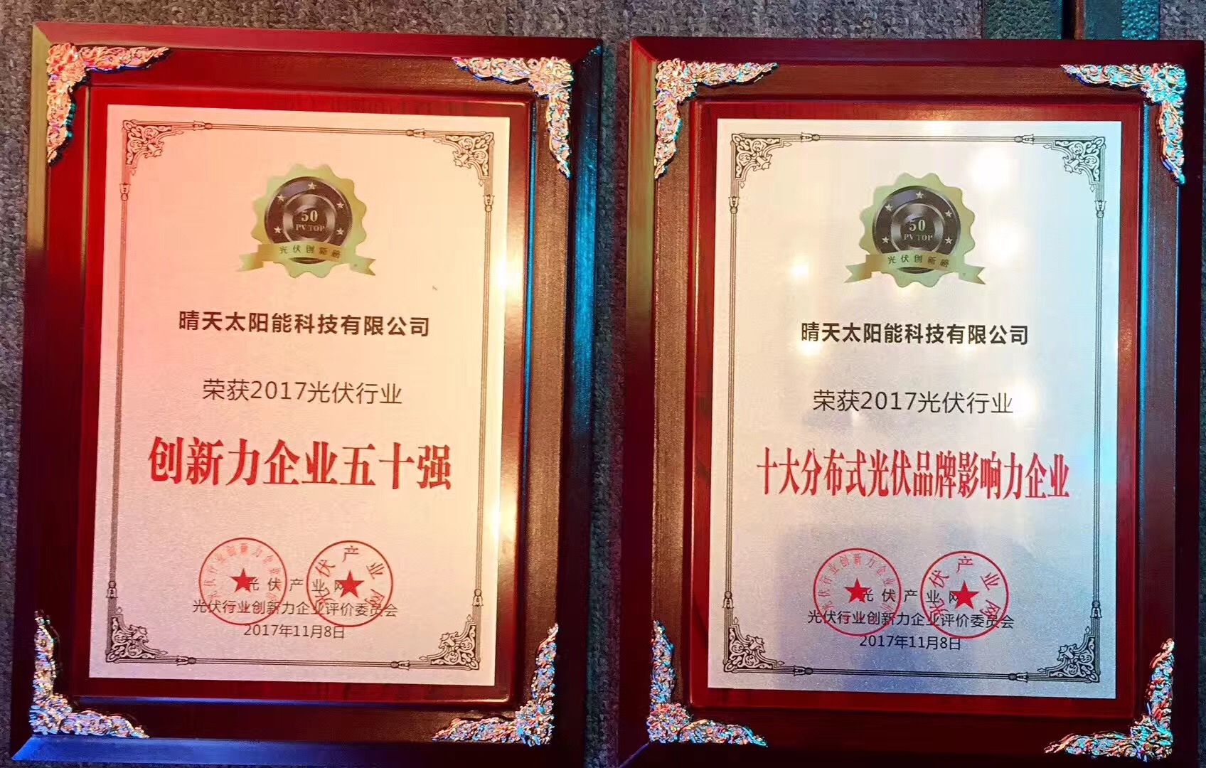 晴天科技憑借在戶用分布式領域的不斷探索和貢獻,連獲兩項大獎。這也是晴天科技繼今年榮獲“2017年度最受歡迎分布式光伏系統集成商”、“2017年度中國戶用光伏服務商十大影響力品牌”之后,收獲的又一殊榮。