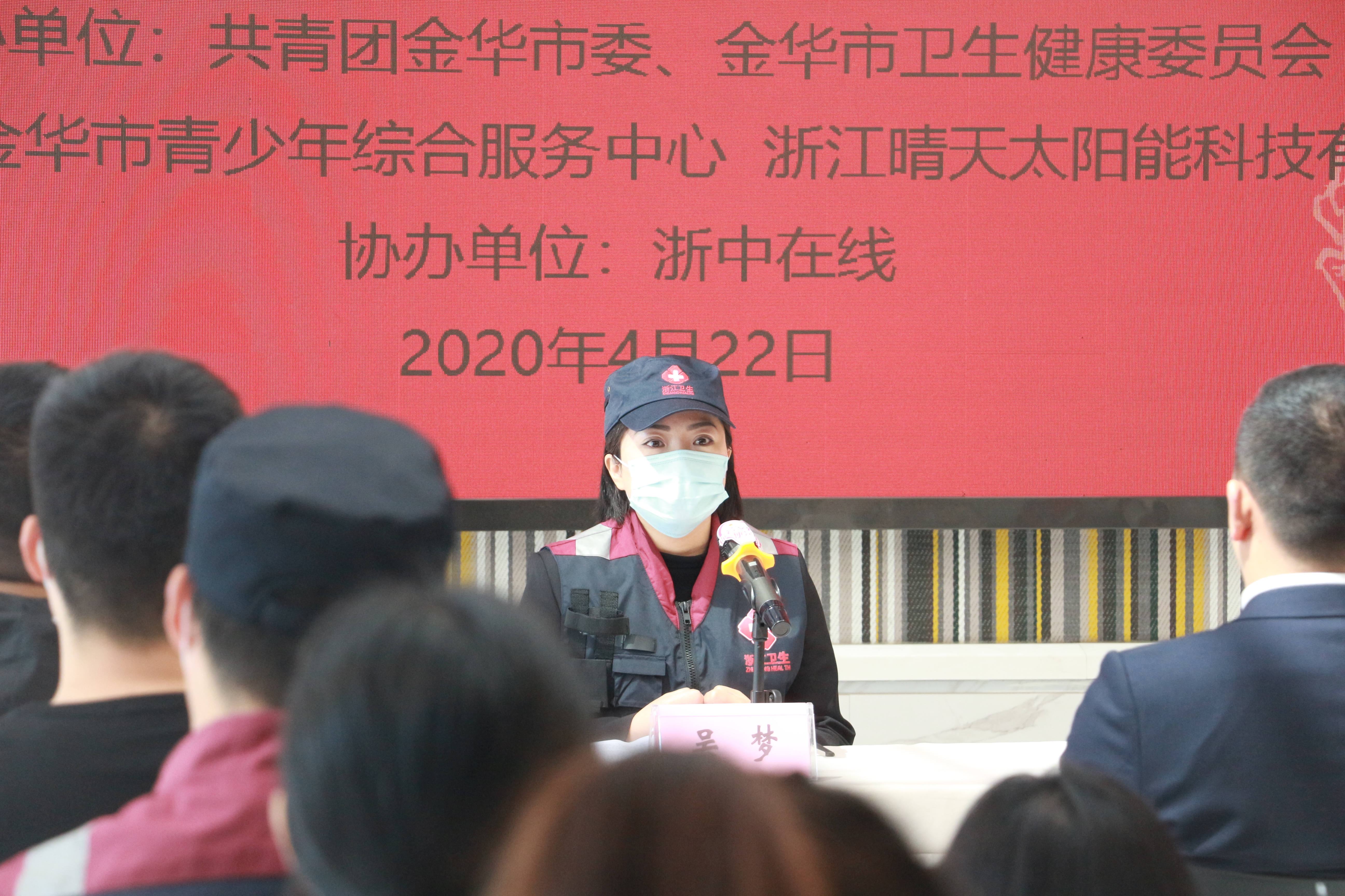 中共金華團市委書記錢福安、衛(wèi)健委團工委書記陳思睿、晴天科技董事長丁一波、市區(qū)援鄂抗疫醫(yī)護人員代表、市區(qū)團員青年志愿者代表、晴天科技志愿者代表等參加儀式。